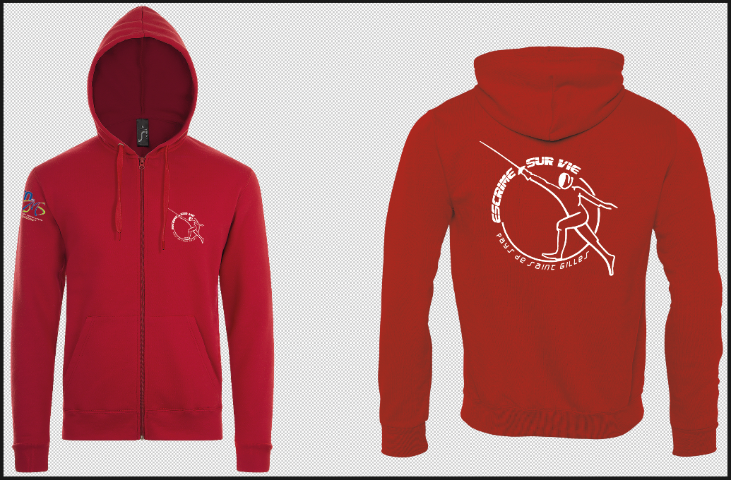 Sweat rouge de type veste, comprenant le logo blanc du Club d'Escrime de Saint-Gilles-Croix-de-Vie présent sur le coeur et sur le dos.