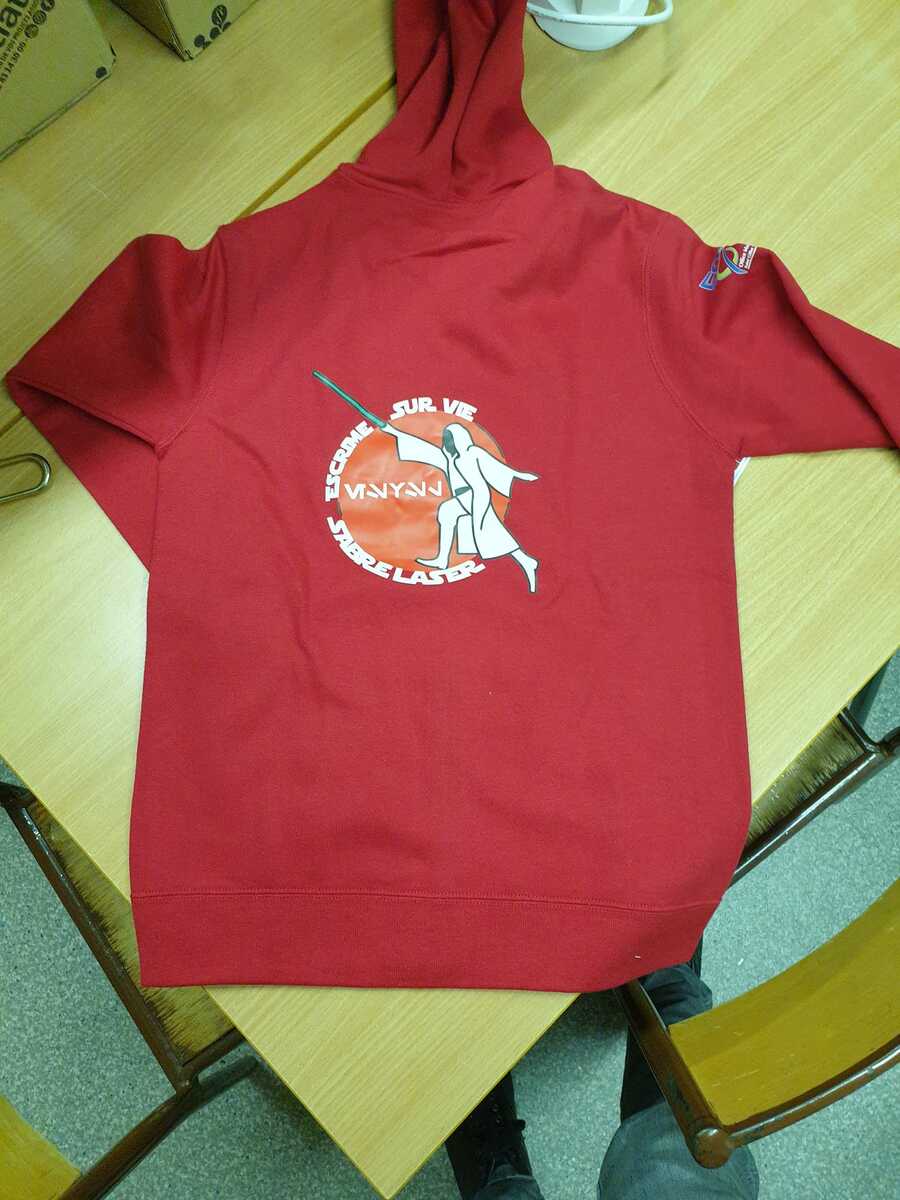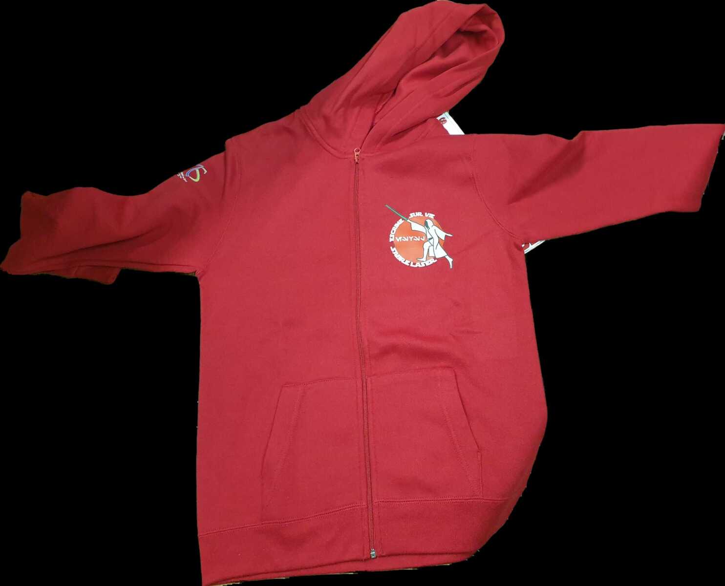 Sweat rouge de type veste, comprenant le logo Sabre Laser du Club d'Escrime de Saint-Gilles-Croix-de-Vie présent sur le coeur et sur le dos.